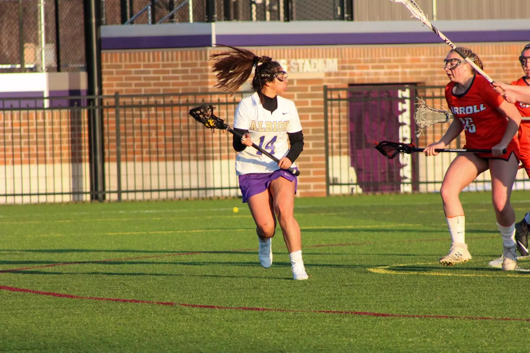 The Purple and Gold rattled off three goals in the first four minutes with two scores from Sophomore Chrystelle Lopez and one from freshman Addie Pastor. The Saints responded by netting a pair of goals to trail by one. Undeterred, Albion went on another 3-0 run from three different Britons. Two more strikes from Lopez expanded the Albion advantage to 8-4 at the 10:00 mark. Then, Sienna Heights exploded with five unanswered goals to take its first lead of the game. However, with under a minute remaining in the half, seniors Darcy Muns and Kate Mullins found the back of the net to retake the lead, 10-9.