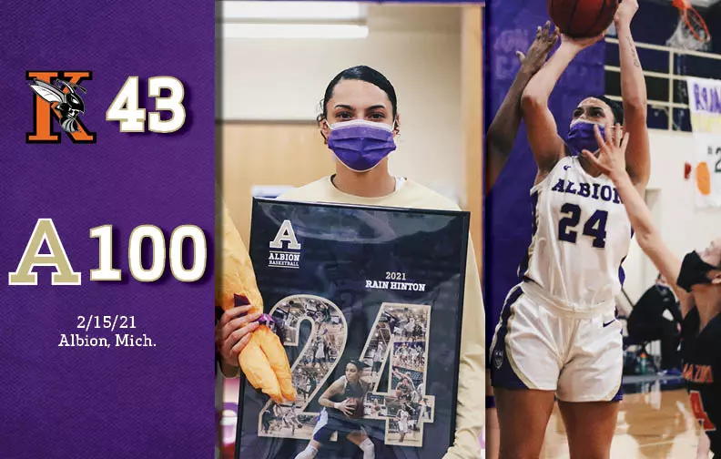 Box Score ALBION, Mich. -- On Senior Night, the Albion College women's basketball team shined in a 100-43 win over Kalamazoo College. Prior to the game, the Britons recognized lone senior Rain Hinton along with team managers Ciara Beal and Jaz Dykes.